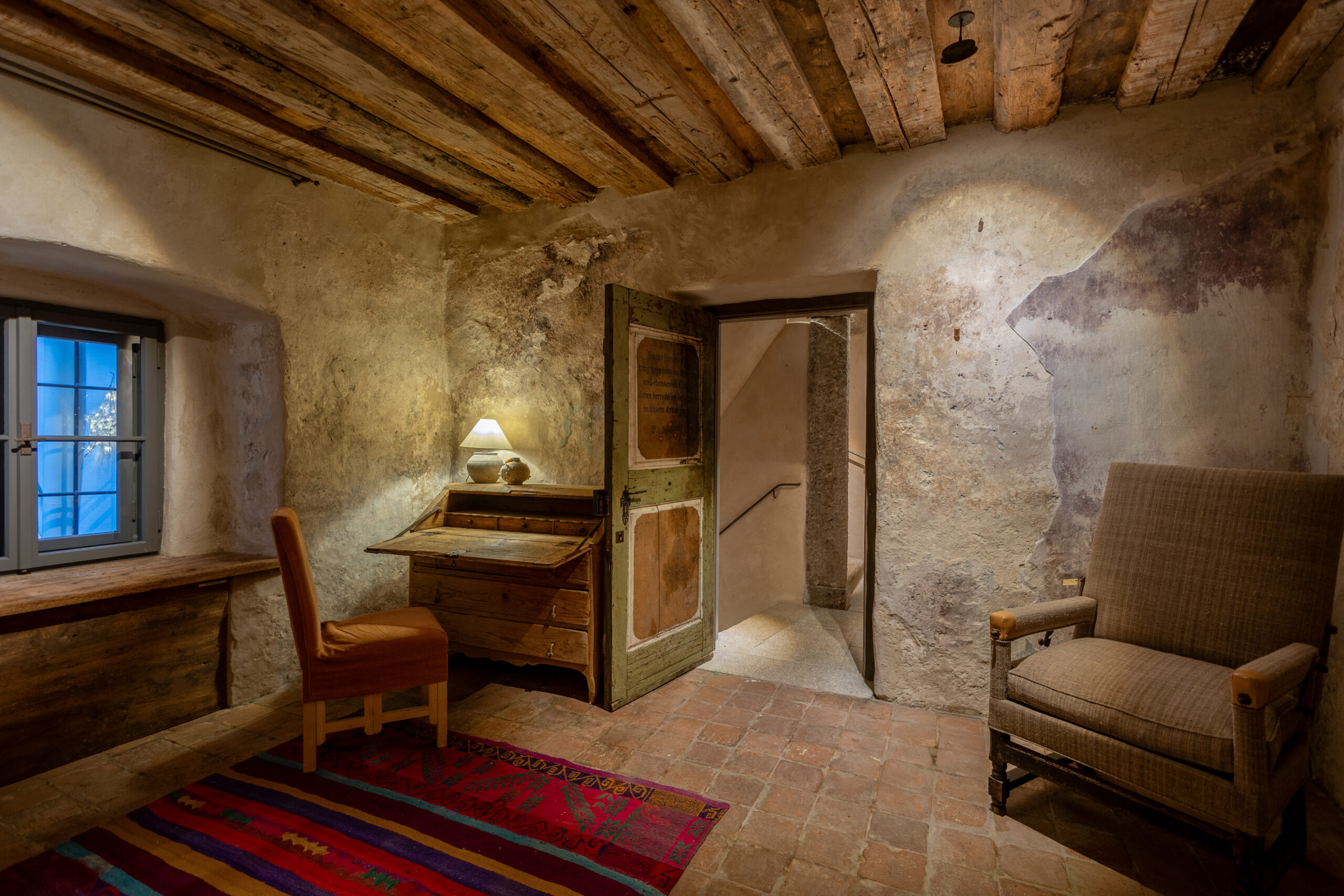 Die Möblierung wurde entsprechend dem Grundsatz des gesamten Hauses - "The Beauty of Imperfection" - u.a durch von Axel Vervoordt entworfenen Einzelstücken gestaltet . Aus der Kombination historischer und moderner Elemente entstand ein zeitgenössischer Wohnstil, der in Salzburg seinesgleichen sucht.